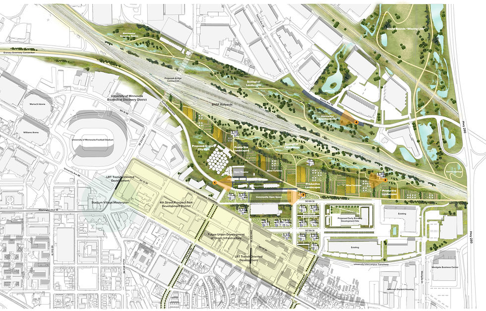 Granary Road was an obsolete rail corridor that formerly serviced the University of Minnesota coal steam power plant. In 2010 the City of Minneapolis and the Minnesota Department of Transportation planned to turn the corridor into a truck route. As an Urban Designer with the Metropolitan Design Center we partnered with the local community group to propose a pedestrian and bicycle greenway as an alternative. The idea and design proposal were compelling enough that the City of Minneapolis partnered with the University of Minnesota to implement the greenway in 2014. The project is currently under development and will be completed in phases over the next 5 years. The full proposal includes a bicycle and pedestrian connection from Downtown Minneapolis to St. Paul as well a new Granary Park situated in and around the historic SEMI Milling and Grain Silo district.